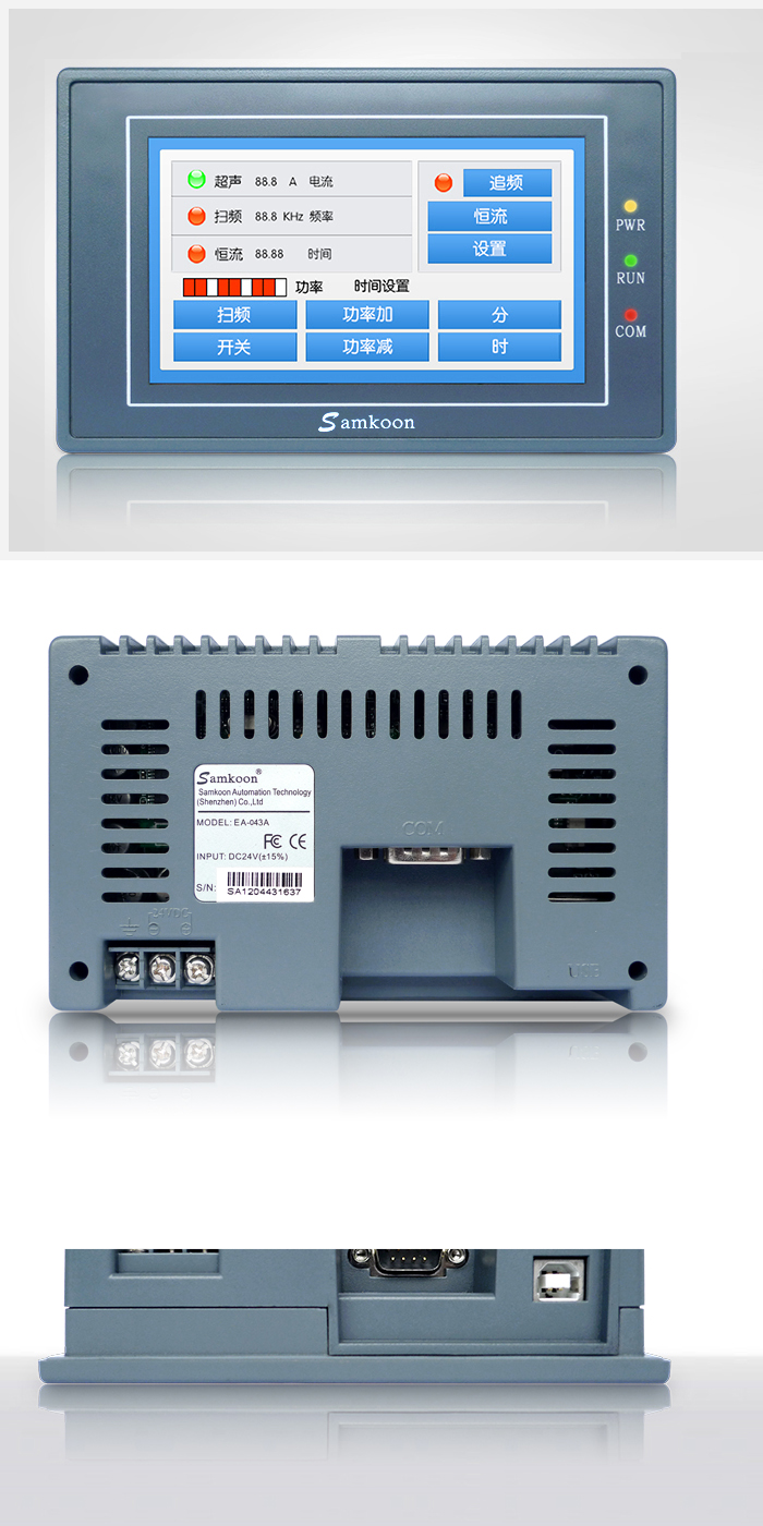顯控(Samkoon) EA系列觸摸屏采用了強大的32位微處理器,功耗小,溫升小,機器不易發生故障和老化,提高了系統的可靠性。顯控(Samkoon)系列觸摸屏符合EN55022EN55024標準,符合FCC,Class A,具有很強的抗干擾能力,符合工業環境的電磁兼容要求。其包括了內存儲器,外接系統程序存儲器,電源電路模塊,通訊模塊,顯示與觸摸單元等。